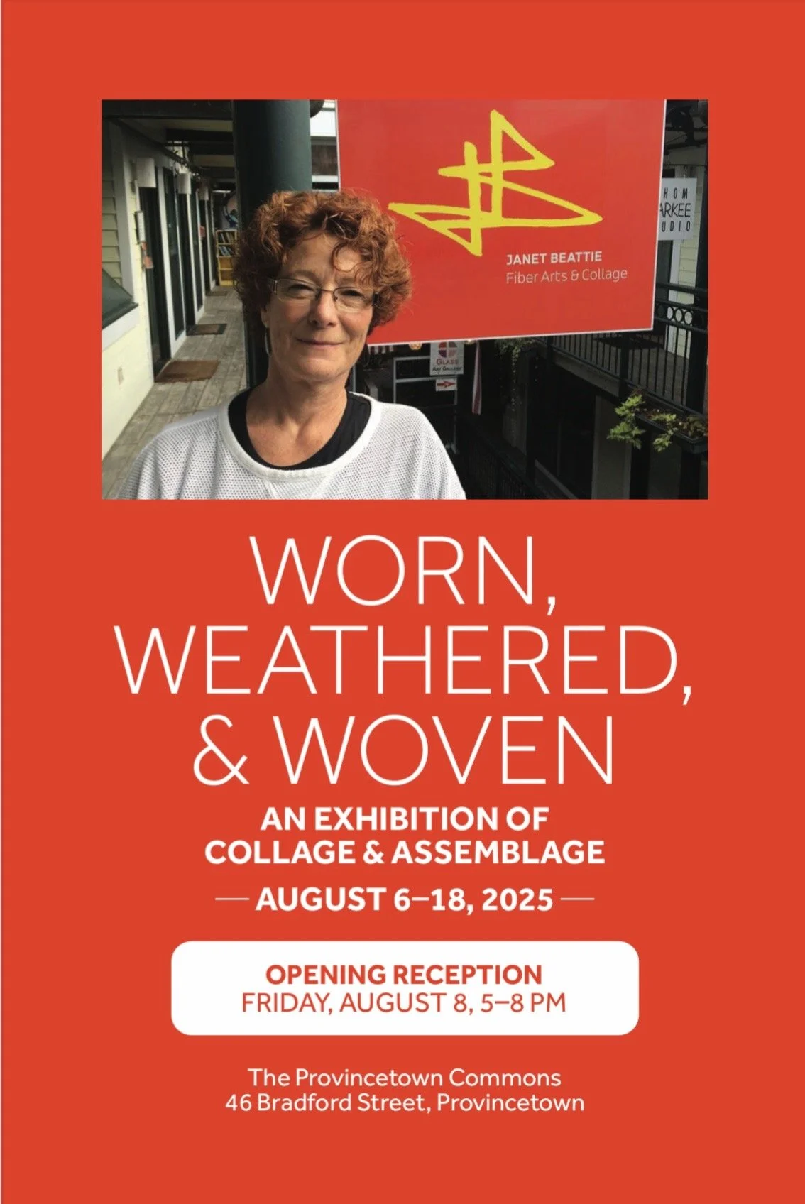 WORN, WEATHERED, WOVEN BY JANET BEATTIEOpening Reception: Friday, August 8 from 5 - 7 PM On Exhibit through August 18The Commons 46 Bradford Street, Provincetownhttps://www.provincetowncommons.org/commons-events/beattie